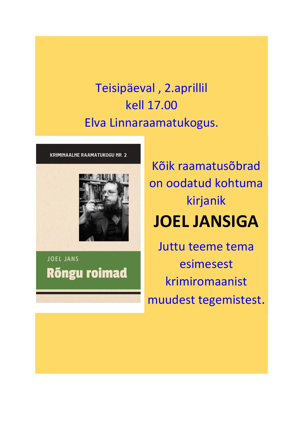 Elva vallast pärit kirjanik Joel Jans on eesti ulmekirjanik ja tulihingeline ulme- ja õudusfilmihuviline. Eesti Kirjanike Liidu romaanivõistlusel 2019. aastal pälvis ta teise koha käsikirjaga „Tondilatern“, mis ilmus raamatuna samal aastal. Joel Jans on võitnud seitse korda Eesti ulme aastauhinna Stalker.