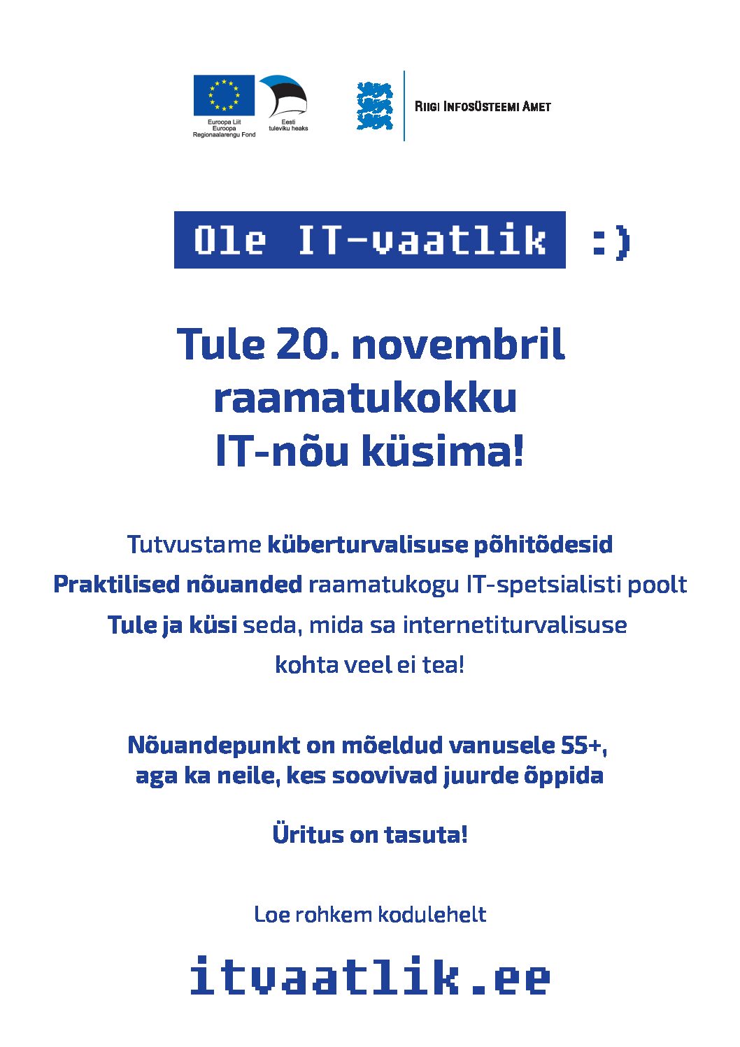 Raamatukoguhoidjad on alati pakkunud abi ja aidanud inimesi nii arvuteid kui nutiseadmeid kasutama. RIA koos ERÜga kutsub raamatukogusid üles tegema 20. novembril üle Eesti raamatukogudest üheks päevaks nõuandepunktid, kuhu vanemaealised saaksid tulla oma raamatukogu töötajalt nõu küsima.