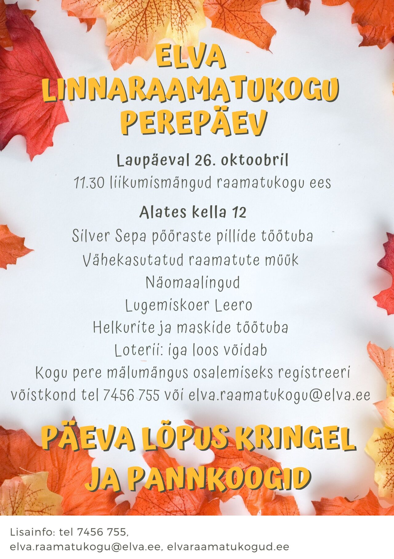 Elva Linnaraamatukogu kutsub osalema laupäeval 26.oktoobril toimuvale perepäevale. Põnevat tegevust leidub igale vanusele.
