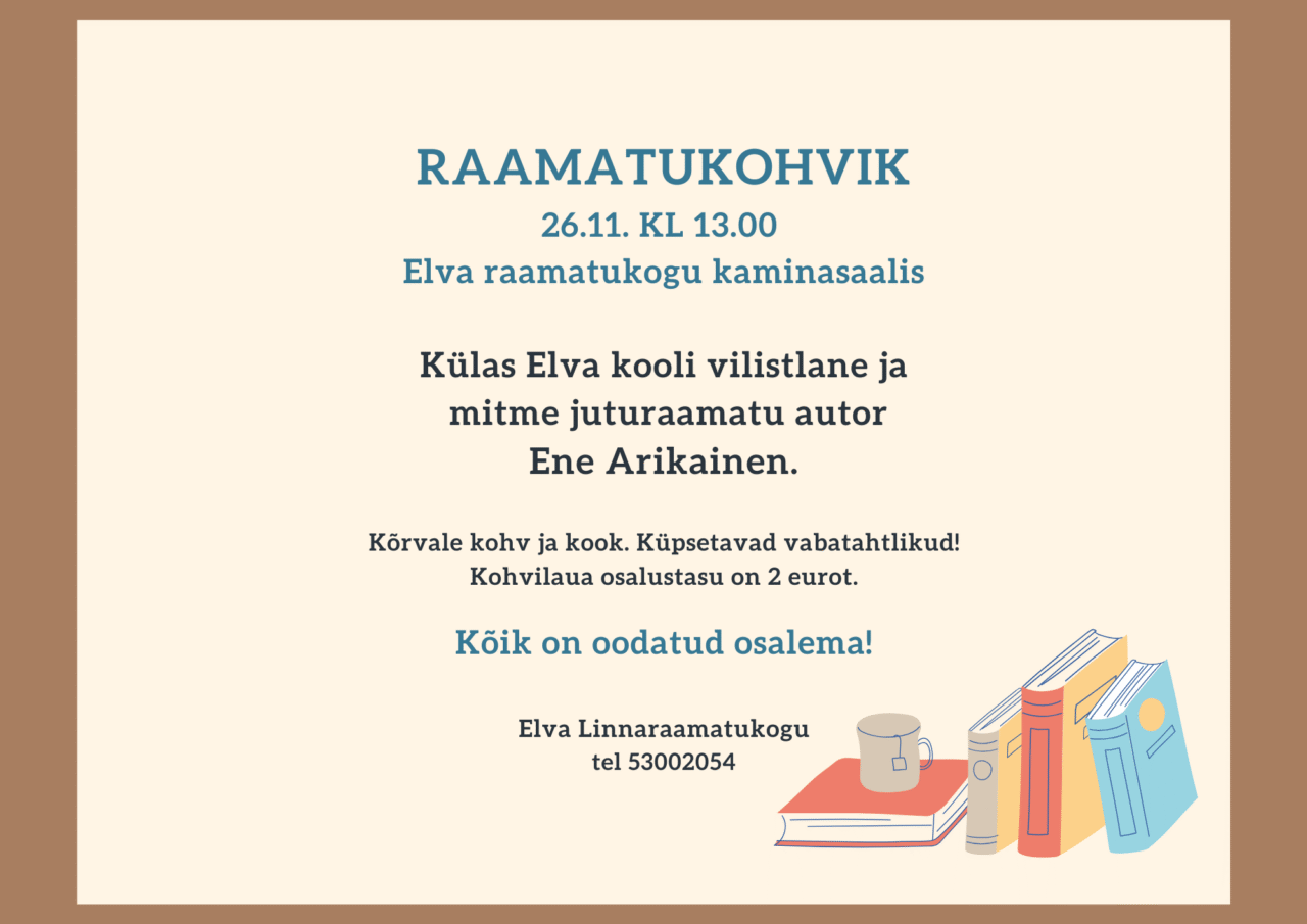 Kolmapäeval, 26.11., kl 13.00 ootame taas kõiki raamatukohvikusse. Kohviku külaliseks on Elva kooli vilistlane ja mitme juturaamatu autor Ene Arikainen. Ene tutvustab oma raamatuid, räägib kirjutamisest jm.