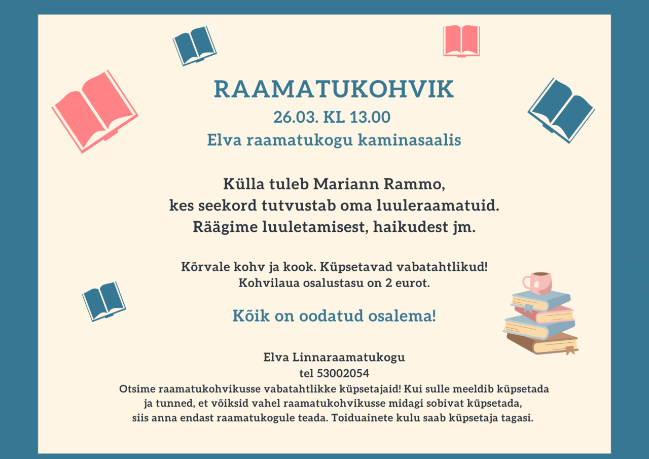 Märtsikuu raamatukohvik avab raamatukogu kaminasaalis uksed 26.03. kl 13.00.