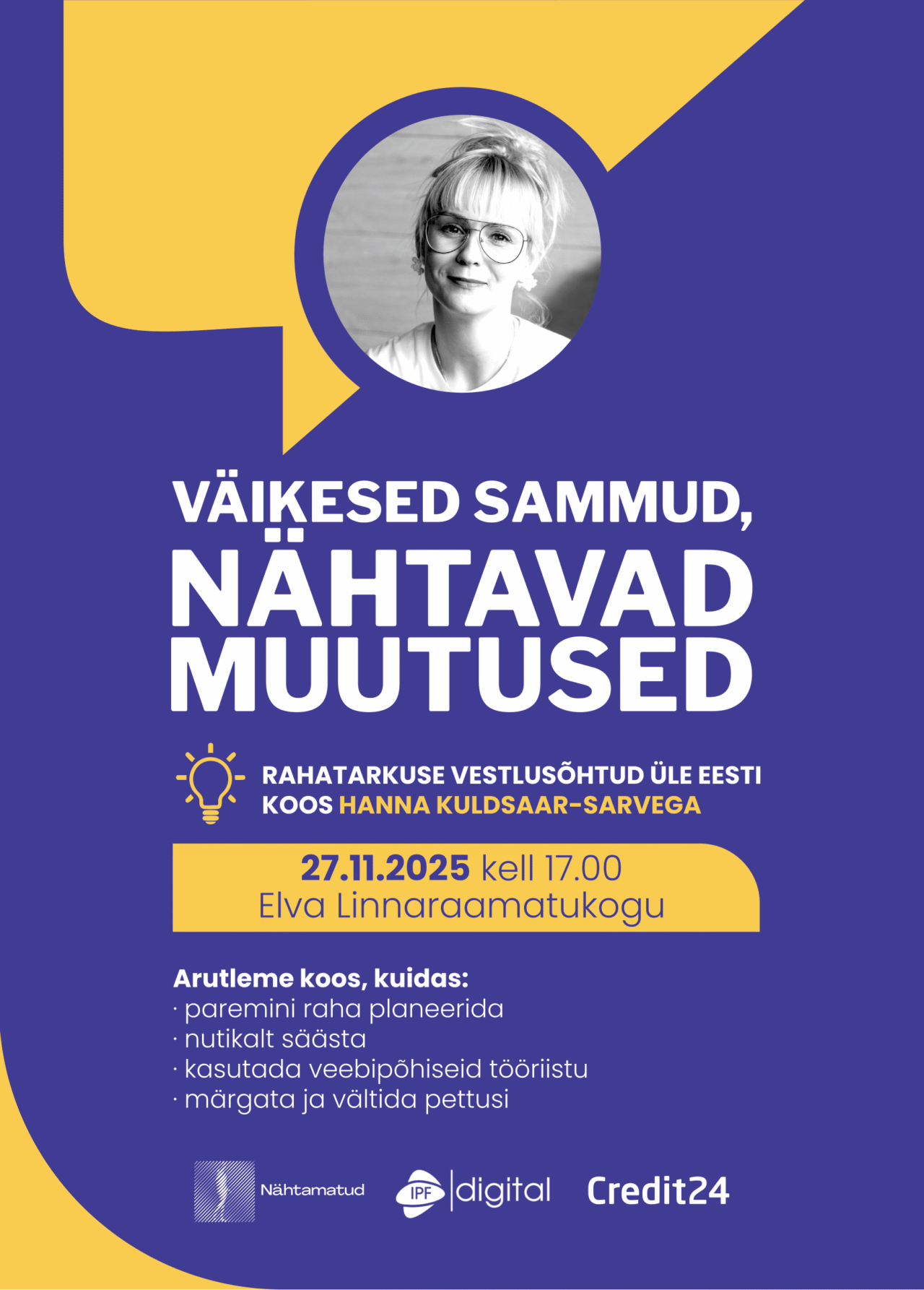 Räägime ausalt, hirmudeta ja häbita, kuidas teha väikseid, aga nähtavaid samme rahateadlikuma elu suunas. Peaesinejaks on Hanna Kuldsaar-Sarv – pereema, ettevõtja ja rahatarkuse entusiast, kes räägib avameelselt, kuidas ta õppis rahaga toime tulema, eelarvet looma ja oma rahalist kindlust kasvatama. Koos Hannaga arutleme koos, kuidas:- paremini raha planeerida- nutikalt säästa- kasutada veebipõhiseid tööriistu- märgata ja vältida pettusi. Õhtut juhib Meelis Sarv.